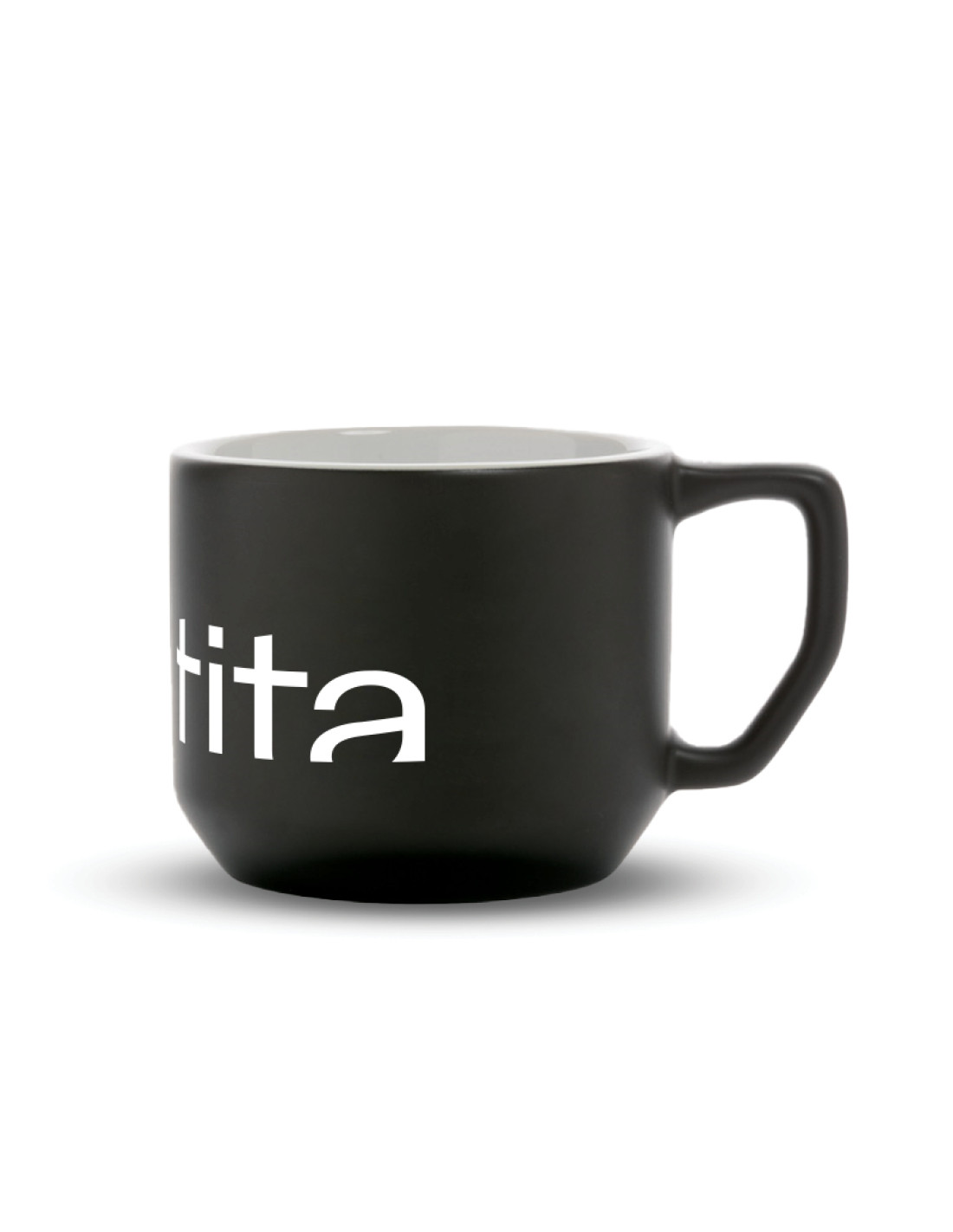Minimalistický černý porcelánový hrnek s bílým logem projektu Identita – příběh českého grafického designu. Objem 350 ml.