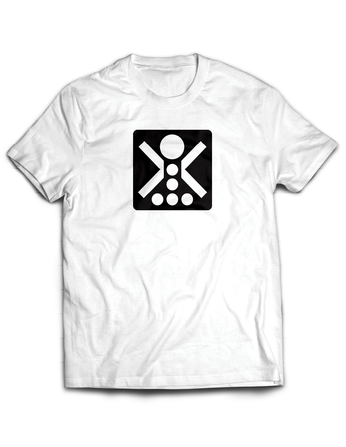 Bílé unisex tričko s černobílým motivem tzv. bobkujícího panáčka - piktogramu tehdejšího měniče mincí z prvního orientačního systému pražského metra z dílny Jiřího Rathouského.