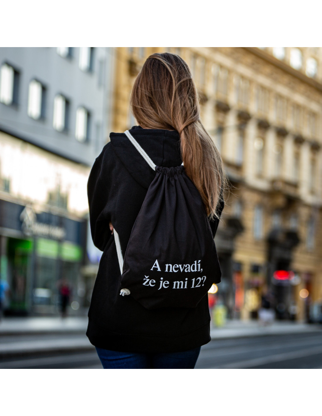Černý šňůrkový batoh s grafikou dokumentárního filmu V SÍTI