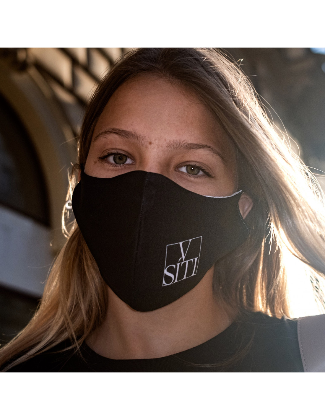 • Dvouvrstvá obličejová maska s černými gumičkami za uši a sublimačně tištěnou grafikou.